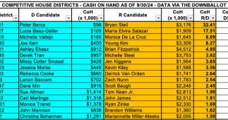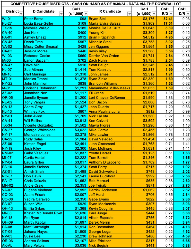 The spreadsheet is sorted by ratio between the two, with the races where the Republican nominee has the highest cash advantage over the Democrat at the top.