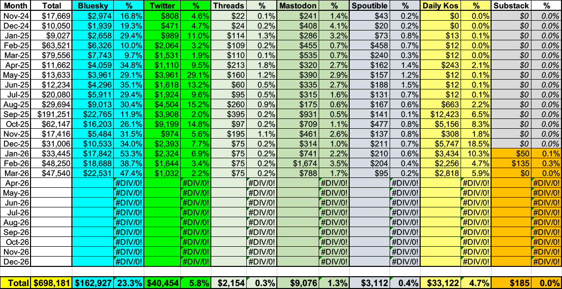 I've changed my social media engagement methodology; since I've solidly established that Bluesky (and other platforms) generate several times more engagement (clickthrus per follower) than Twitter, I'm going to focus purely on actual funds raised via each.